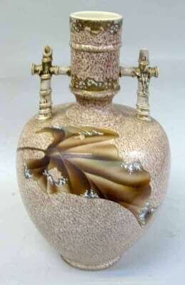 Of ovoid form, the straight neck and handles are stylized in the form of bamboo branches, leading to a ovoid brown speckled body decorated with gilt and color leaves.