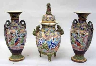 Comprising of a koro, surmounted by a kyline, with two applied kyline to the shoulder of the base, the center panel is enameled with scholars. Together with two baluster form vases, with similar motif.