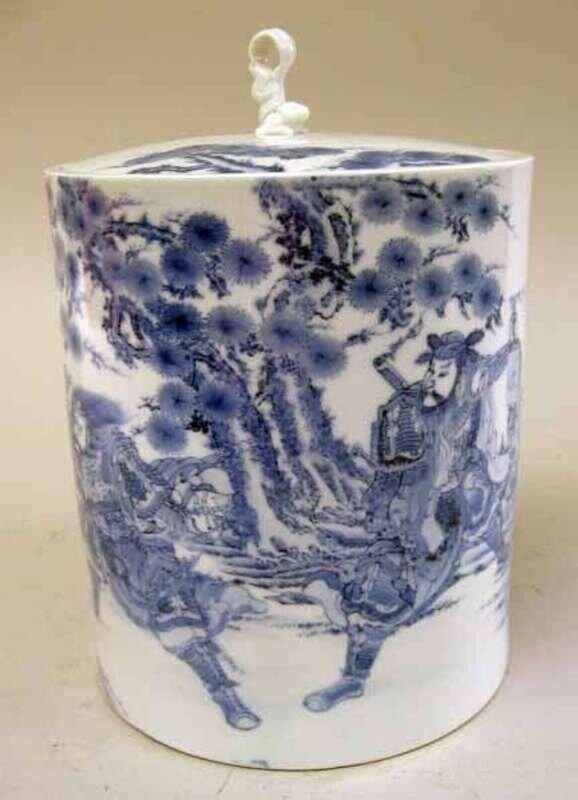 The cover surmounted by a squirrel, the body's blue underglaze depicting a flowering pine tree over samurai in battle.