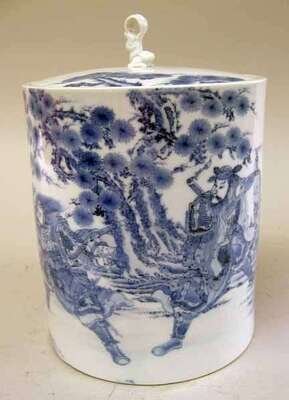 Japanese cylindrical blue and white covered jar. early 20th century