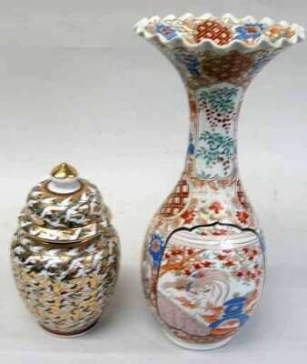 With a scalloped fanned neck, tapering to a baluster body decorated with peony and birds in a typical Japanese garden. Together with a covered vase, decorated in a satsuma style with flying cranes. (2).