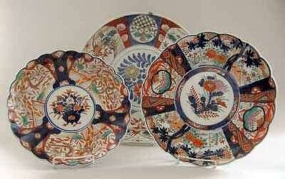 Two with scalloped edges, all with cobalt blue and red underglaze, with central ho-o roundels and chrysanthemum flower sprays.