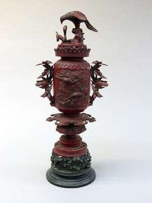 Japanese Bronze red painted urn on stand. 20th century