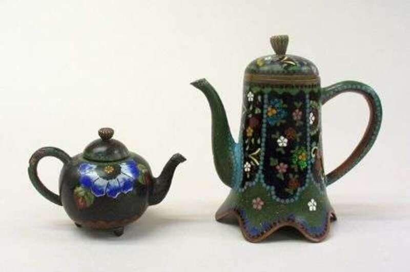 Of ovoid and cylindrical form, both with black ground, worked to show floral sprays and turquoise paneling.