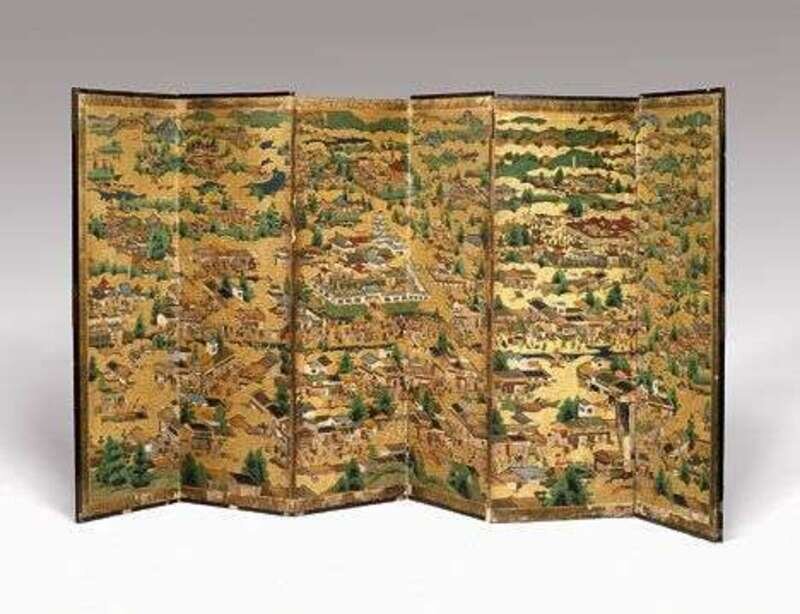 A good period screen, the six gilt and painted panels are borded by a brocaded silk ribbon, the panels depicting a Kyoto procession, moderate losses.