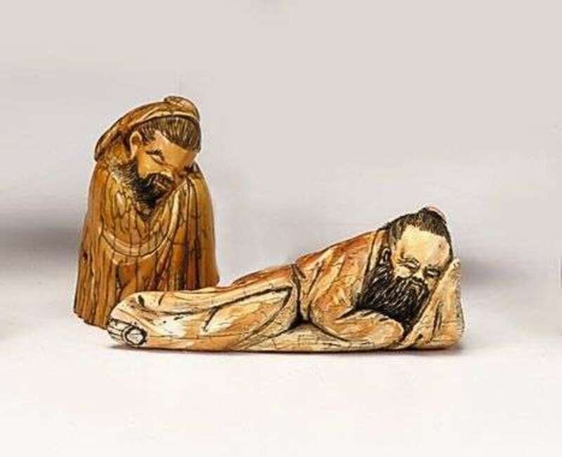 One carved in a seated position asleep, the other lying down asleep.