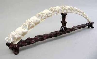 Of convex form, the ivory grouping is carved to show ten graduating elephants in procession.