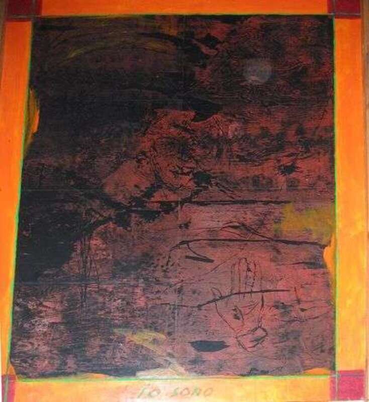 Signed and dated '88' verso. Mixed media on panel, woodcut and paint.