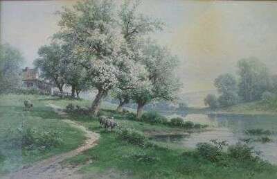 CARL WEBER (AMERICAN 1850-1921) SHEEP GRAZING UNDER A CHERRY BLOSSOM TREE