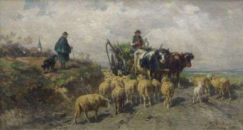 ADOLF CHELIUS (GERMAN 1856-1923) LANDSCAPE WITH HAYWAGON AND SHEEP, HERDER AND DOG