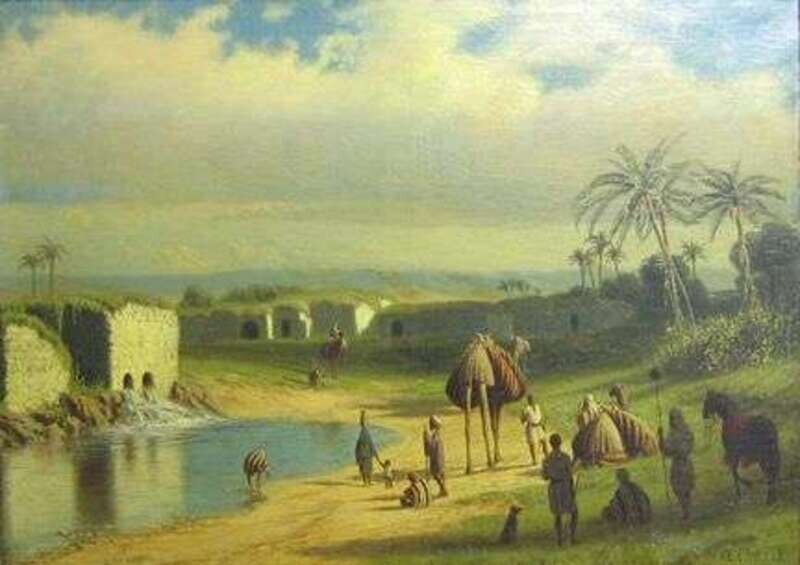 FOLLOWER OF EDWIN LORD WEEKS (AMERICAN 1849-1903) CAMELS AND FIGURES AT AN OASIS
