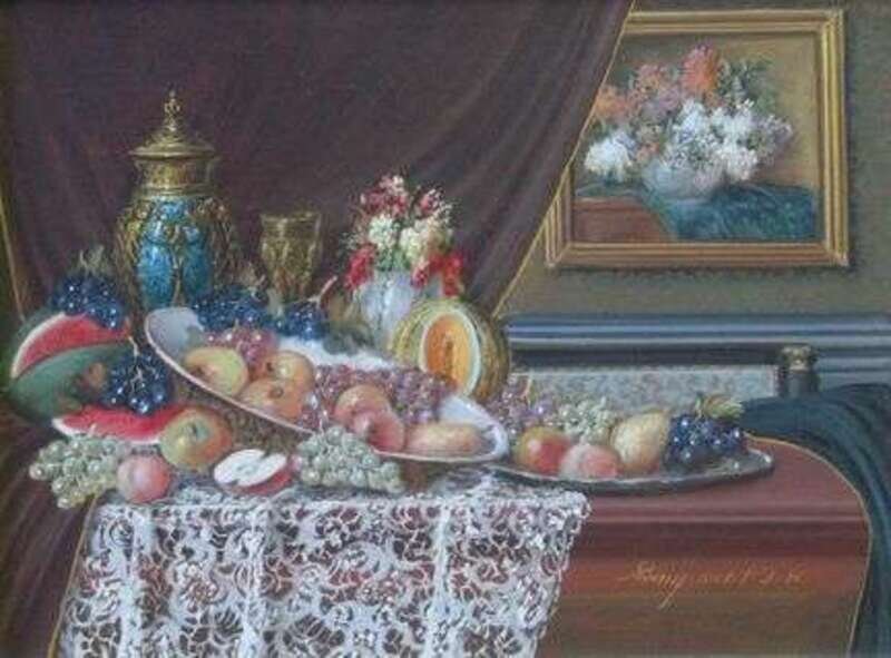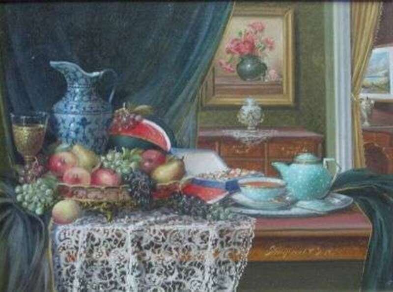 CONTINENTAL SCHOOL (20TH CENTURY)TWO OILS ON BOARD STILL LIFE WITH FRUIT AND FLOWERS and STILL LIFE WITH TEAPOT