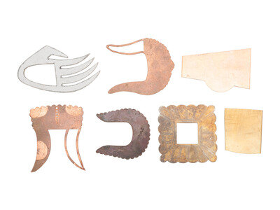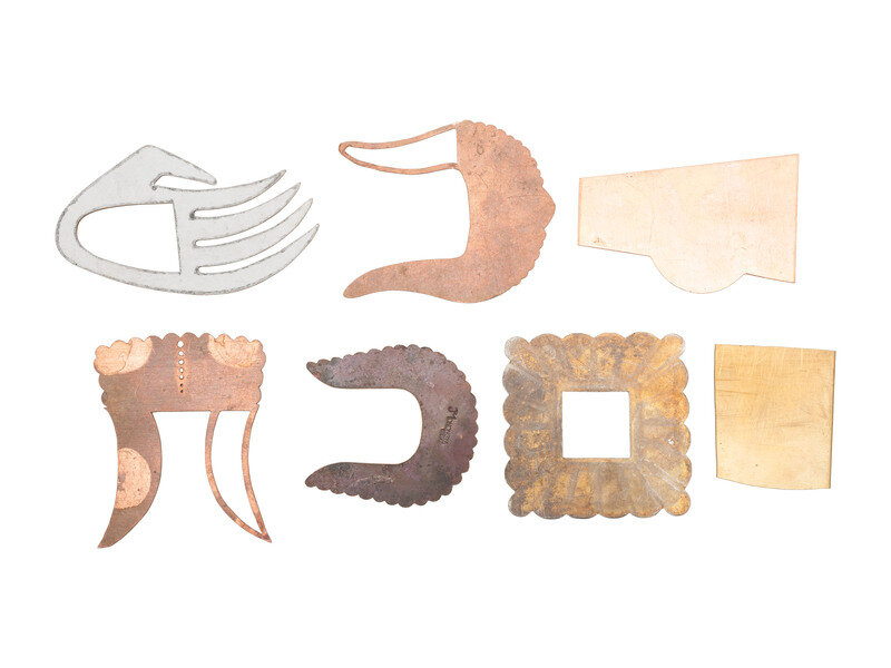a squared copper buckle, partially cutout with etched linear elements