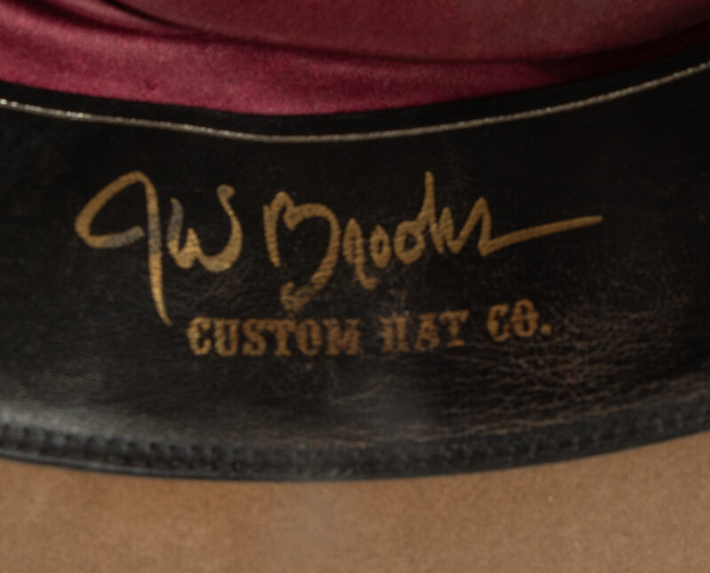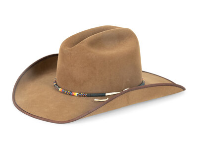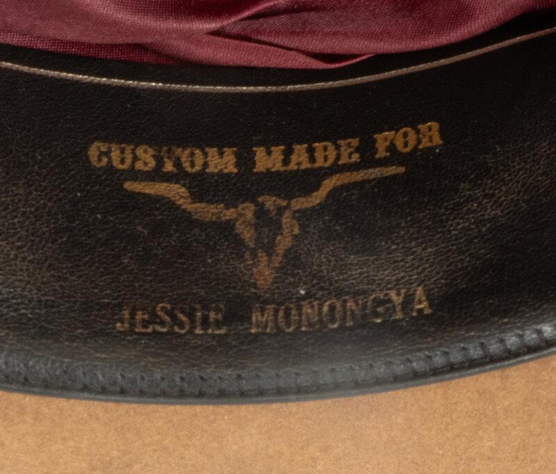 saddle tan, 100x; beaded hat band; stamped on browband Custom Made for Jesse Monongue; size 23-3/4 inches
