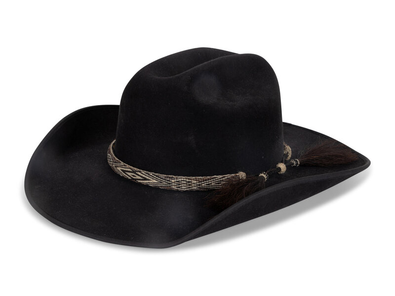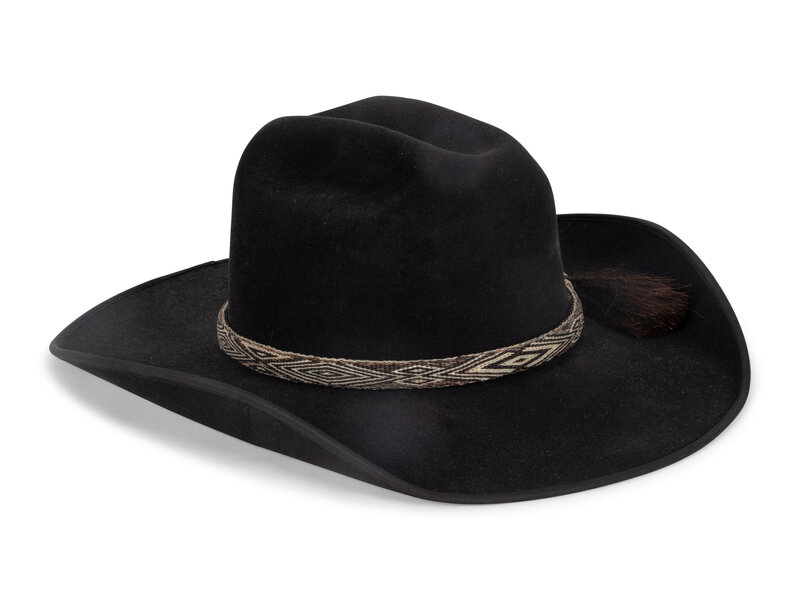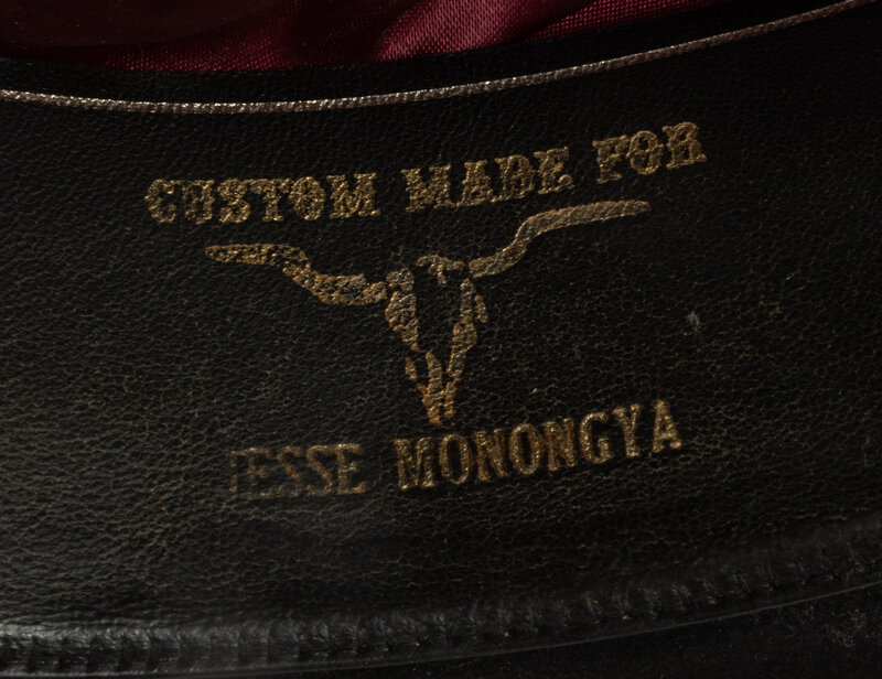 black, 100x with bound edge; hitched horsehair band; stamped on browband Custom Made for Jesse Monongue; size 23-3/4 inches, brim 4 inches, date 3/4/10