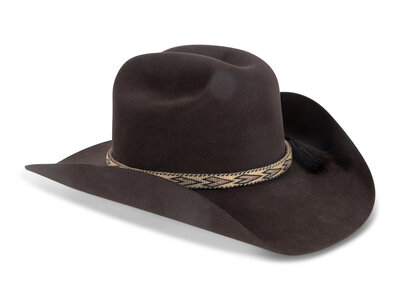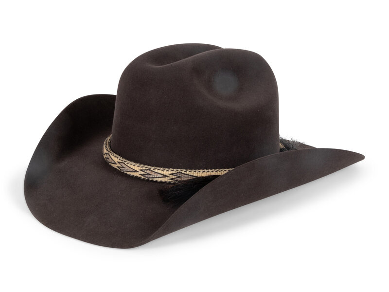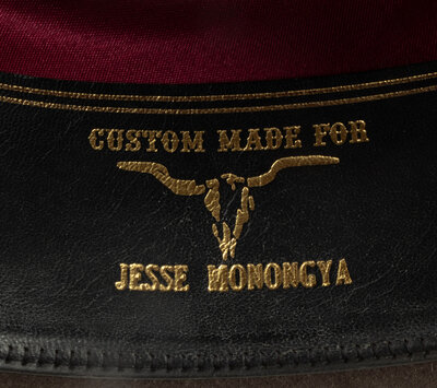 chalk, 100x; hitched horsehair band; stamped on browband Custom Made for Jesse Monongue; size 23-3/4 inches, brim 4 inches, date 10/18