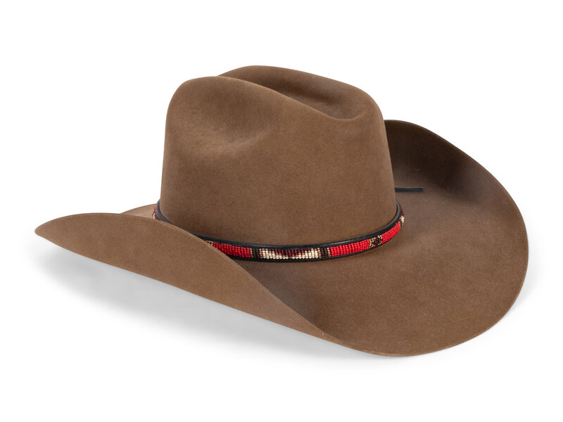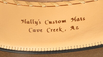 light brown hat by Holly's Custom Hats in Cave Creek, Arizona. 100x, stamped Made for Jesse Monongye on browband, with beaded hatband