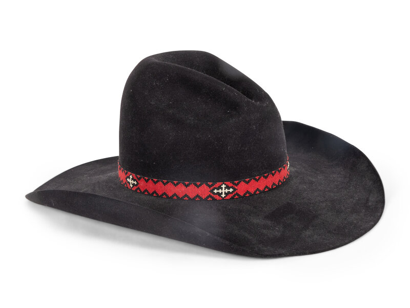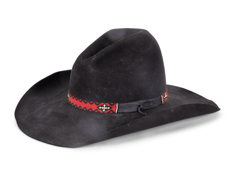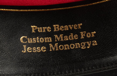 JW Brooks black hat, 100x, size 23-3/4, Stamped Custom Made For Jesse Monongye, and hand written with pen inside browband. Black and red braided horsehair hat band
