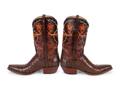 caiman foot with hand-tooled longhorn and barbed wire decorated uppers, snip toe, size 11D