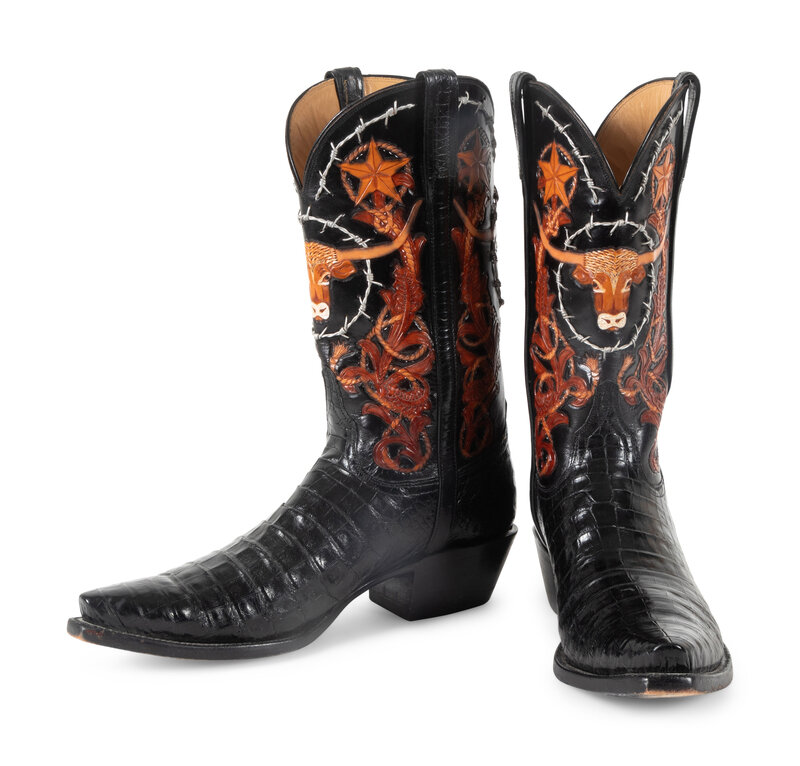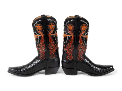 black caiman foot with hand-tooled longhorn and barbed wire decorated uppers, snip toe, size 11