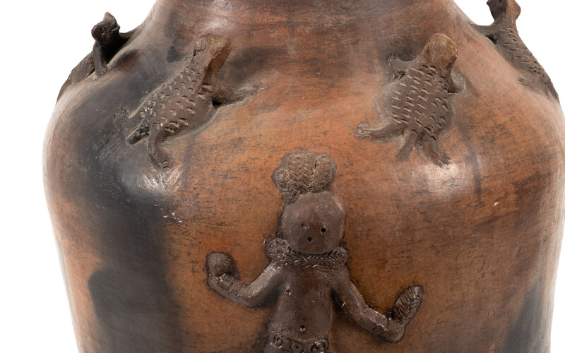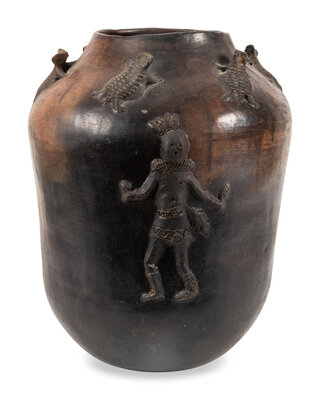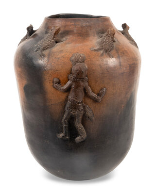 large jar decorated with appliqué figures of Yeibichai and horned lizards; signed J.W. Thorne on base