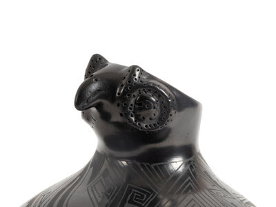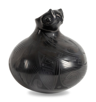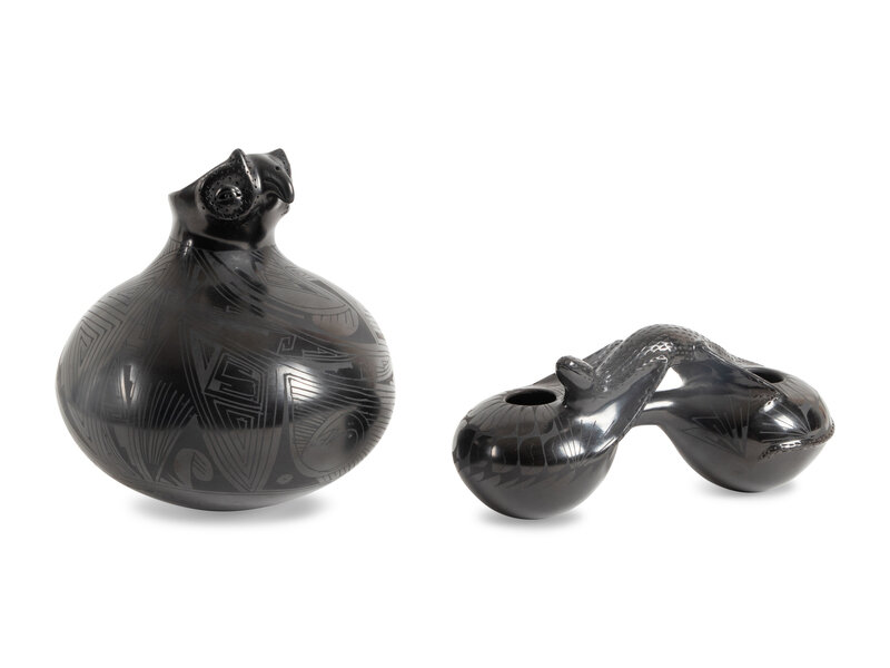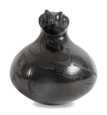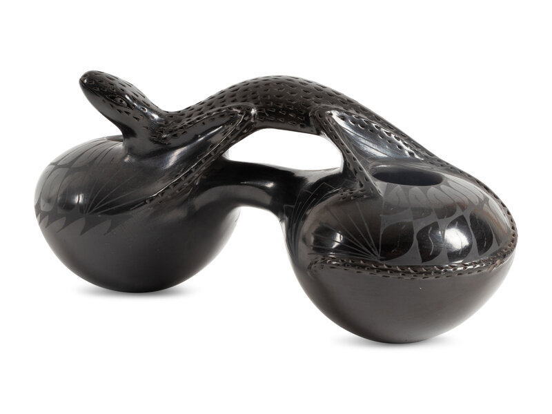 a double-lobed jar with lizard by Rosa Quezado; signed on base, height 4-3/4 inches x length 10-1/4 inches x width 4-1/2 inches