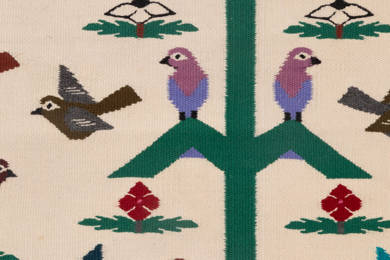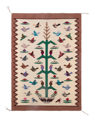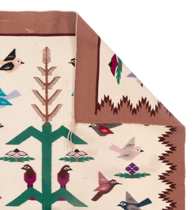 woven with 36 birds flying around and perched on a central cornstalk