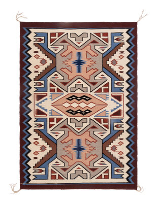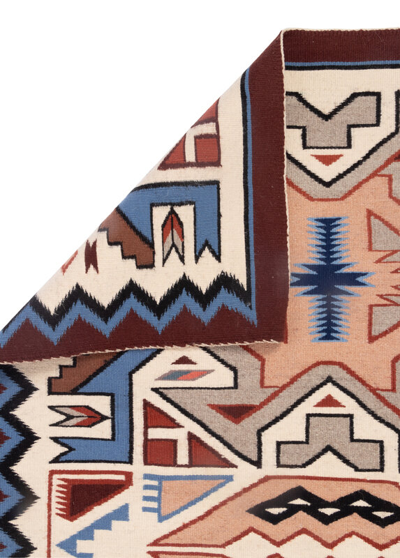 intricate pattern woven with colors of blue, cream, tans, black, and brown