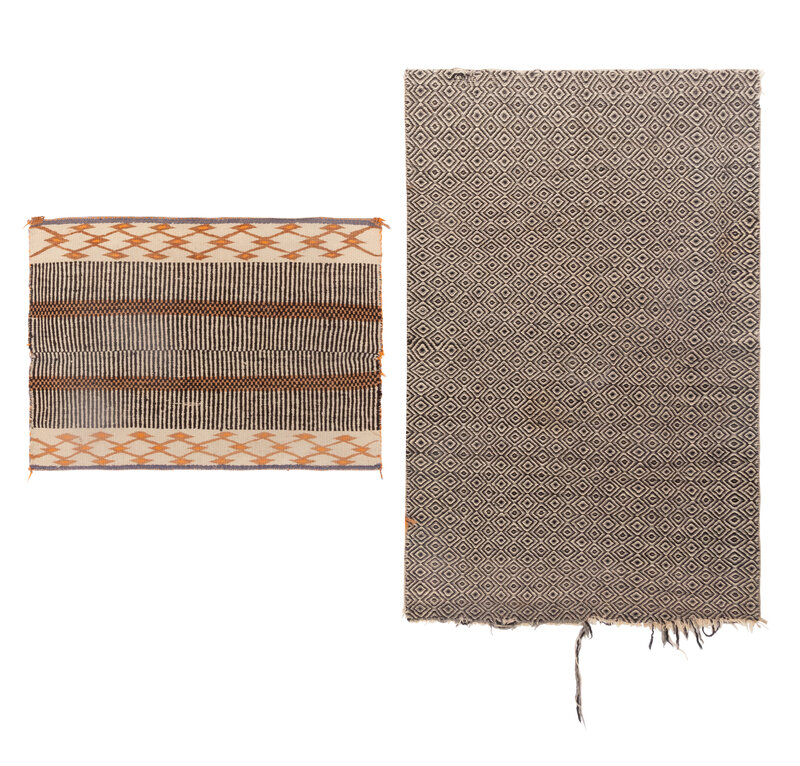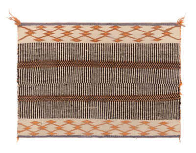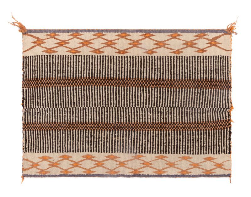 a single saddle blanket woven in orange, blue, black, and brown; having a barbed wire border 25 x 34 inches