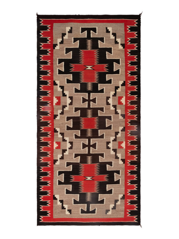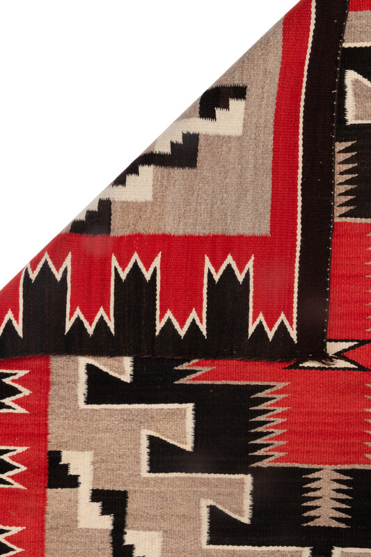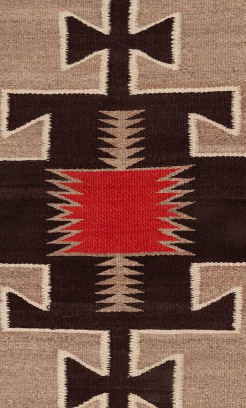 handspun wool woven with colors of red, dark brown, cream, and gray; three terraced diamonds