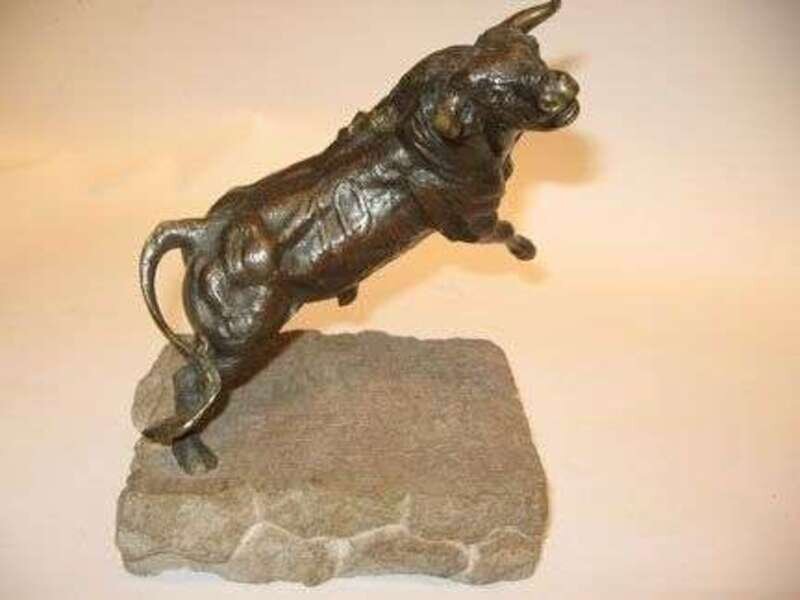 The bull is modeled lunging forward with its front legs of the ground, the side of the bull is inscised with the number 10, over a rectangular stone plinth.