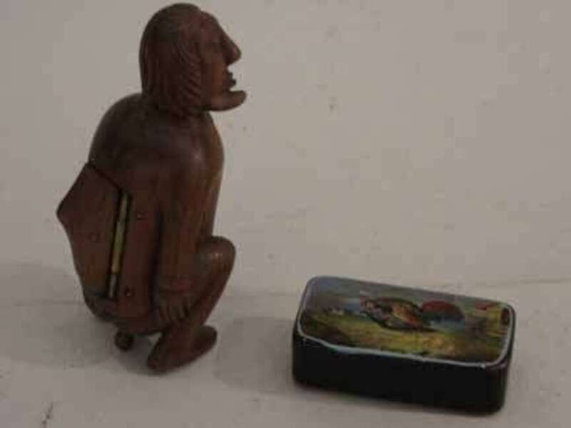 One is a timber carved model of a statesman in a satirical position, the other is a paper mache rectangular box, painted with a pair of courting birds.