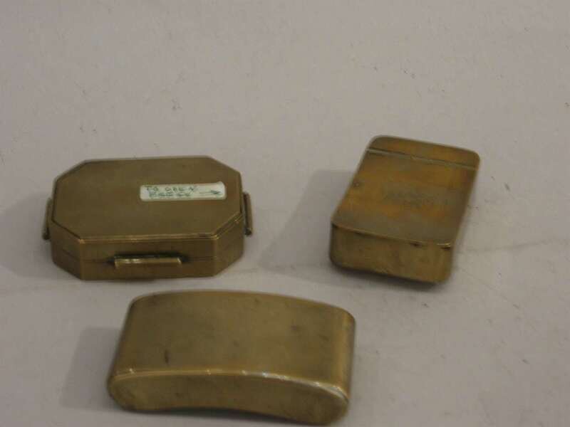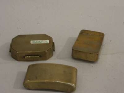 One trick-push snuff, together with two tooled brass rectangular snuff boxes.