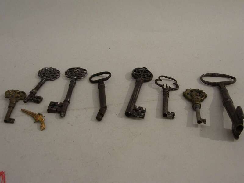 A group of nine night latch keys, mostly iron and British made in different forms for varying purposes. All are highly decorative, including one in the shape of a miniature gun with a loop for it to be worn as a pendant.