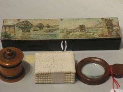 Of rectangular form, lacquered black, applied with a paper gore depicting Ponte de Forth & New York, together with a small porcelain box, and two treen items.