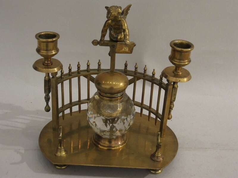 The pen rest and ink wells are paneled to the rear by a fence gallery surmounted by a putto, terminating in two free swinging candle holders.