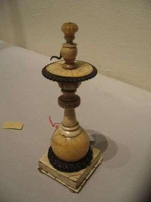 Applied to an ivory and bone turned finial is a gilt metal arm suspended over a circular numbered disk, mounted to the edge with a gilt metal panel, over turned sectional column above a square bun footed base.