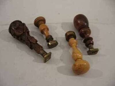 One of carved walnut worked to show vine leaves and fruit, A.M, two boxwood seals P.E, and a rosewood seal with a Pegasus above W.J.