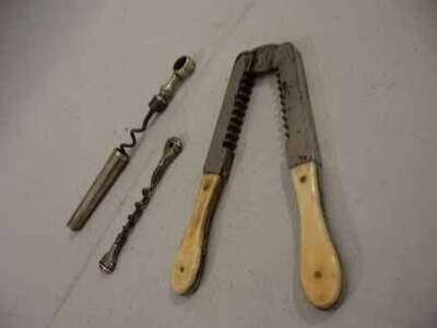 Including a bone handled champagne opener, together with two small silver plated cork screws.