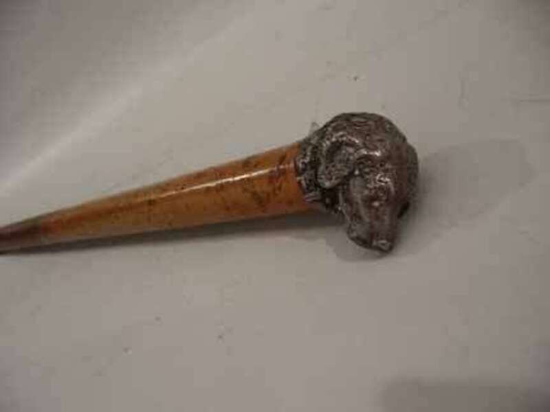 Mounted with a silver model of a hound's head, the stick of timber tapering form, leading to a turned foot.