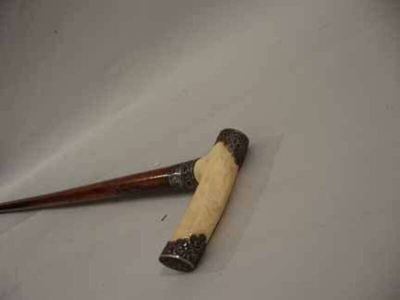 With a shaped ivory handle terminated at both ends with a pressed silver cap, leading to a pressed silver collar decorated with foliate scrolling leaves and flowers, the malacca stick of straight tapering form.