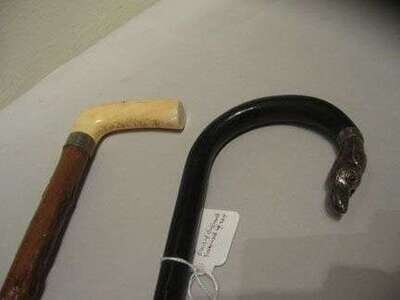 One of walrus tusk handle, and knurled timber stick, the other of simulated ebony, with a silver greyhound head tip.