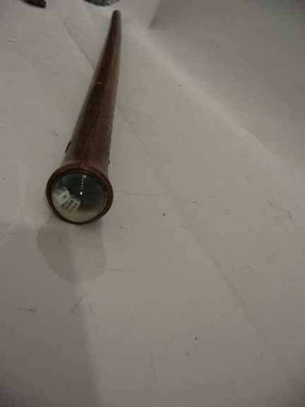 Of solid walnut , straight in form, with a glass covered dome housing two free moving dice, with a brass foot.