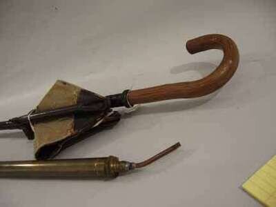 Brass rose sprayer is pump operated with a timber handle, together with a timber and leather sports stick.