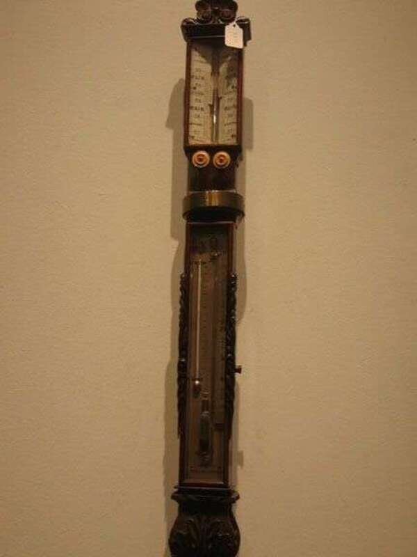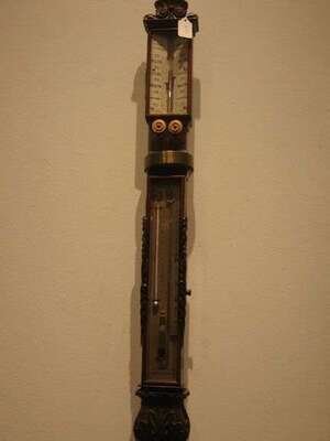 C. West, of long rectangular form, carved shell crest above ivory and silvered metal indicators flanking a mercury measuring tube.