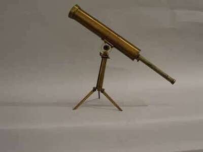 Inscribed RAMSDEN, LONDON, over a folding tripod, that fits to the interior of the scope, thumbwheel rack & pinion fine focusing, single drawtube focusing, 2 in subject lens, dust cap, dent to body, two lens replacements.