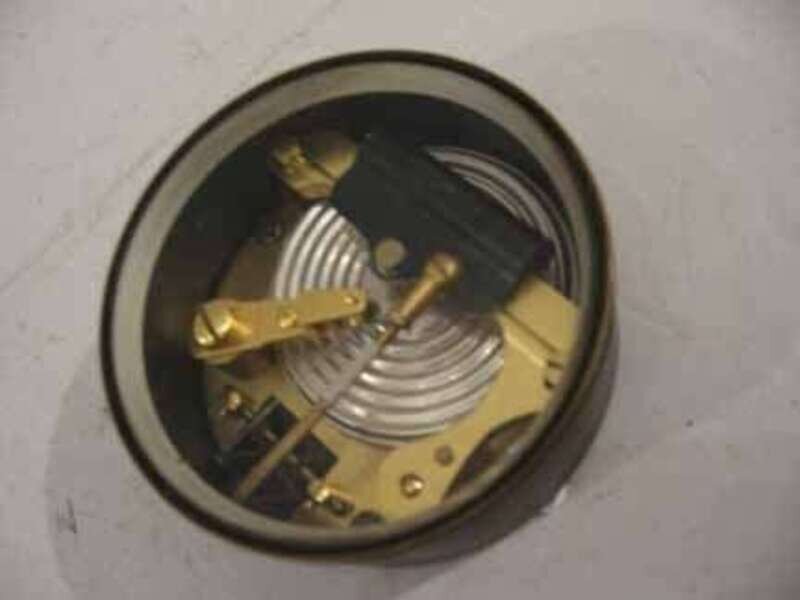 The cylindrical barometer is of brass and painted metal with the glass viewing window revealing the barometer mechanism.