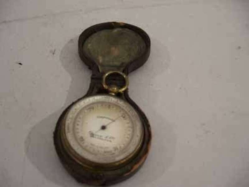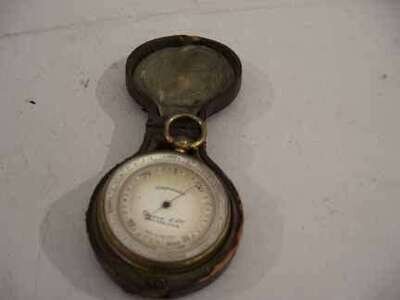 Retailed by Queen & Co, brass plated, pocket watch form. with hoop pendant, in a leather case.