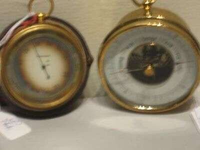 The pocket barometer is brass, in a leather case, together with a brass and glass domed barometer.