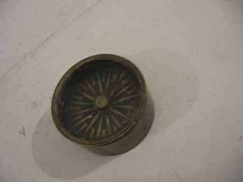 The black and white card compass dial is enclosed in a glass and brass circular case.